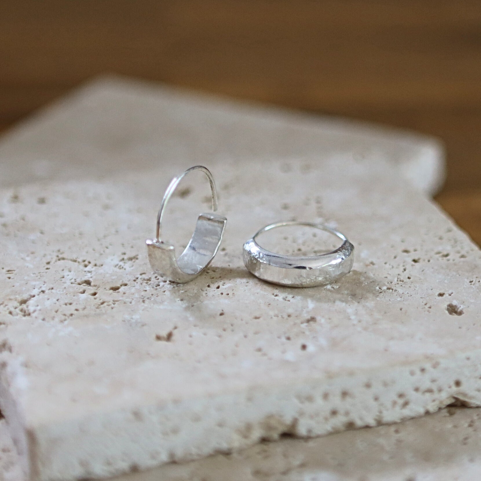 Silver Earth Hoops feature a textured curved bar connected to a thinner wire which goes through the ear.