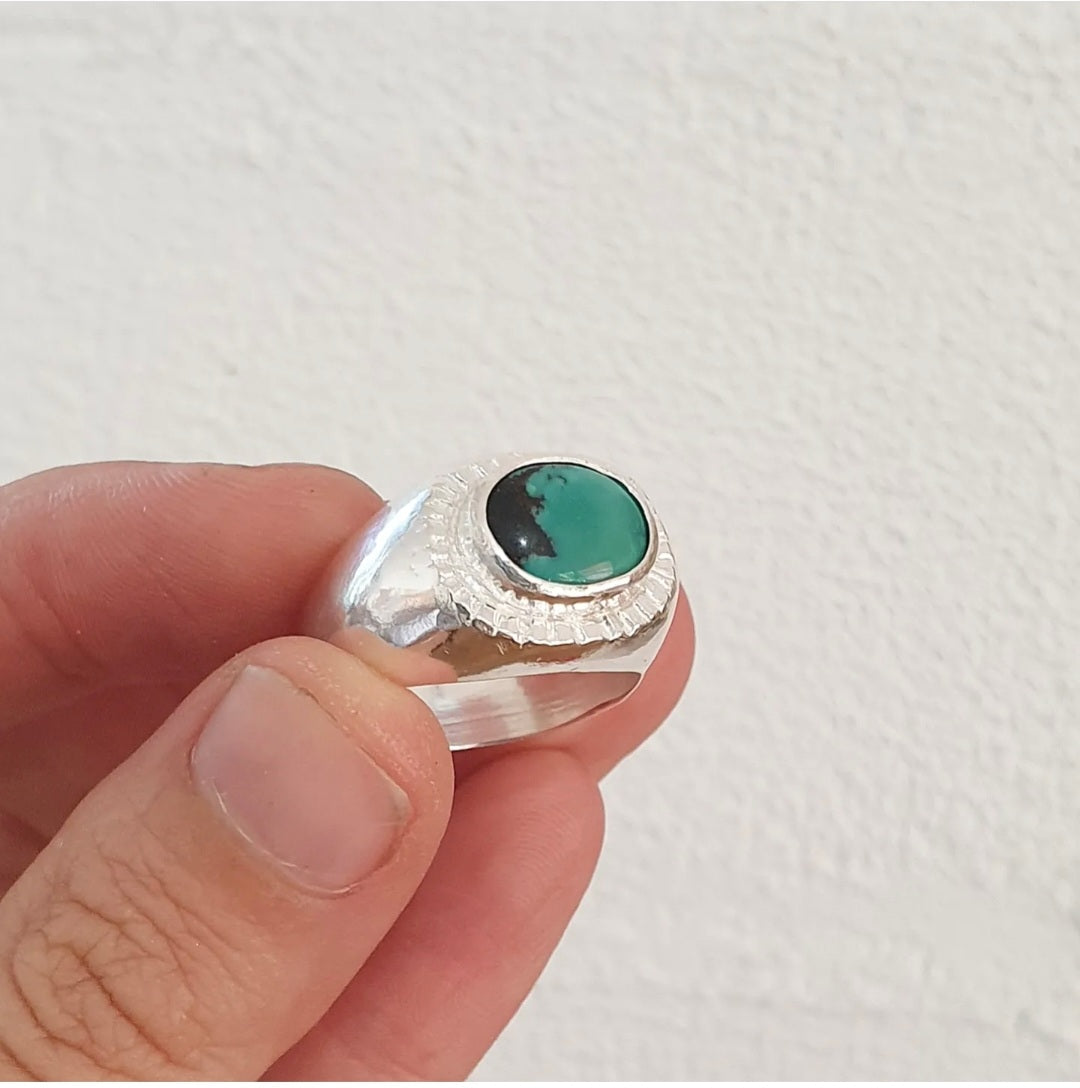 This Turquoise Carve Ring has been lovingly hand carved in wax and then sand-cast in Recycled Sterling Silver with a bezel set Turquoise